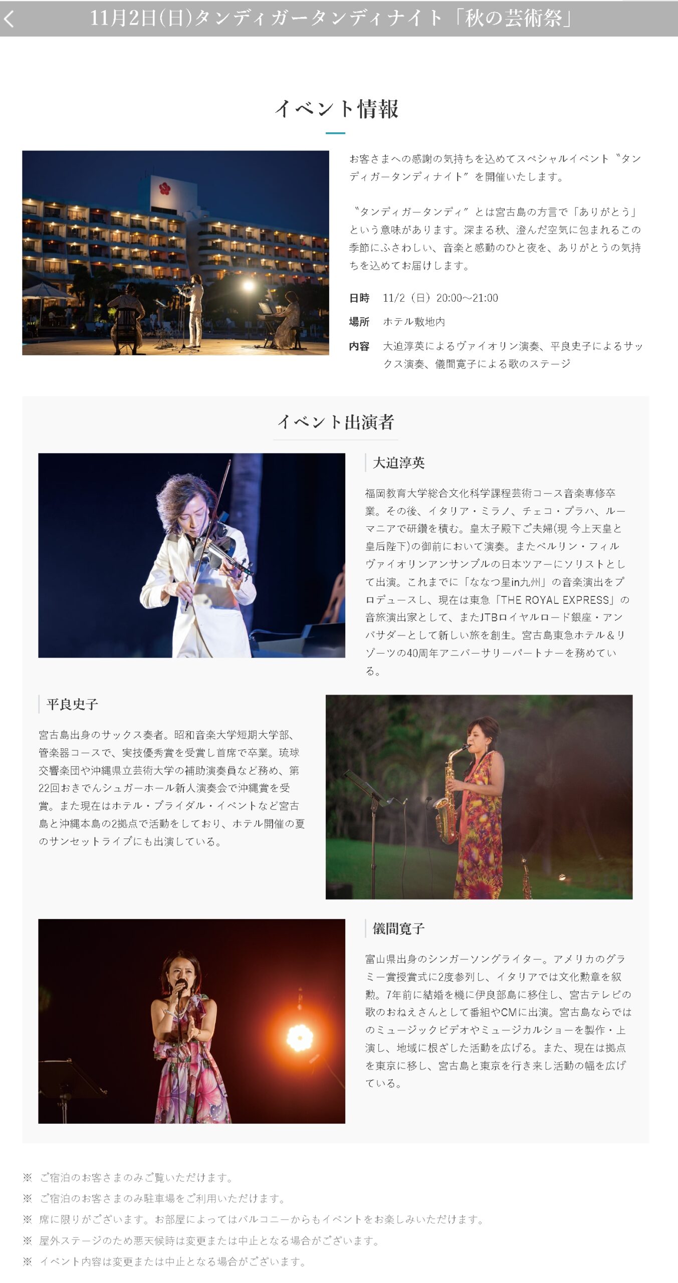 [沖縄]宮古島東急ホテル&リゾーツ・タンティガータンディナイト[秋の芸術祭]2025年11月2日(日)20:00〜21:00[会場] 宮古島東急ホテル&リゾーツ・ホテル敷地内(沖縄県宮古島市下地与那覇914) 入場料:宿泊者限定[出演] 音旅演出家®・ヴァイオリニスト:大迫淳英 チェロ:堀内 美貴子 ピアノ:傳 かおり[プログラム] 未定