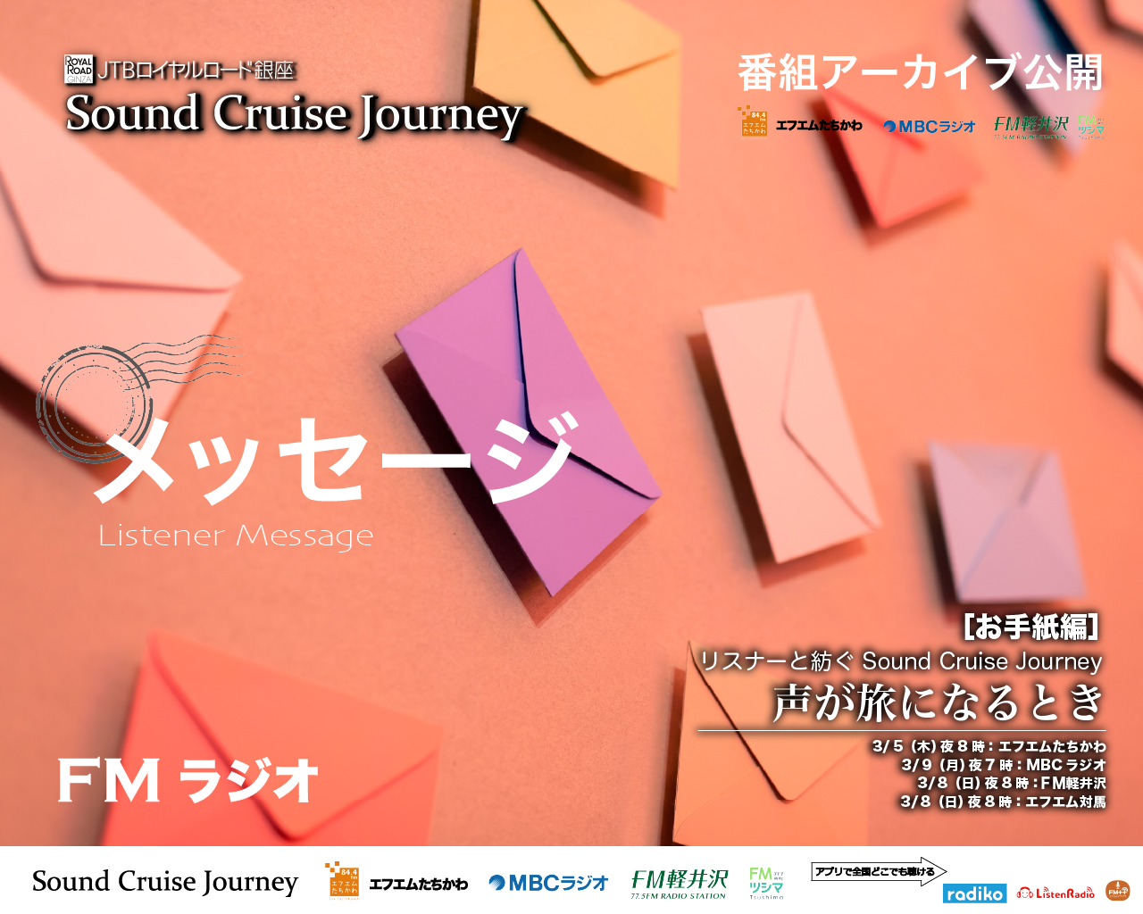 第231回放送[東京]FMたちかわ:2026年3月5日20:00〜20:30[鹿児島]MBCラジオ:2026年3月9日19:00〜19:30[長野]FM軽井沢:2026年3月8日20:00〜20:30[長崎]エフエム対馬:2026年3月8日20:00〜20:30